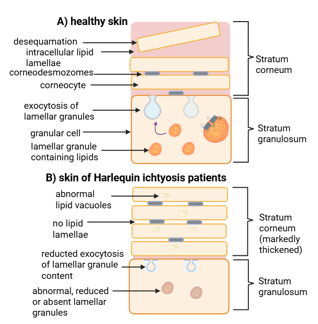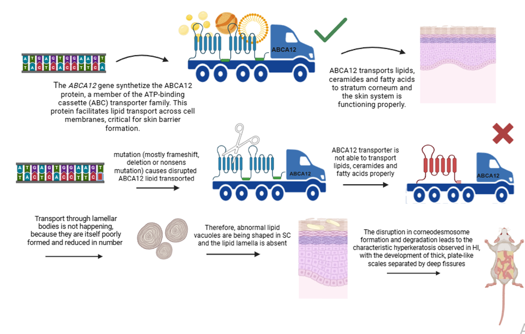 ABCA12 přenáší lipidy, ceramidy, cholesterol a mastné kyseliny do horní vrstvy epidermis – stratum corneum, prostřednictvím lamelárních tělísek. V případě mutace v genu ABCA12 se lipidy nepřenášejí do lamelárních granulí, které samy o sobě mají abnormální tvar, jsou redukované nebo zcela chybí. V důsledku toho je exocytóza obsahu lamelárních granulí omezená a v korneocytech (terminálně diferencovaných keratinocytech), které by se normálně v kůži zdravých lidí odlupovaly, se tvoří abnormální vakuoly obsahující lipidy. Pacienti s HI mají znatelně ztluštělou kůži, protože se přirozeně neexfoliuje.